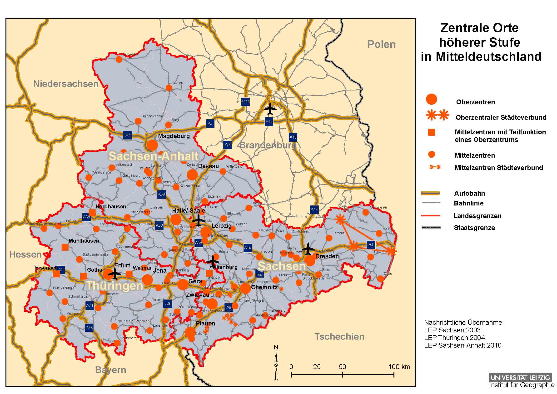 Abb. 3: Zentrale Orte höherer Stufe in Mitteldeutschland, Karte: Universität Leipzig, Institut für Geographie.